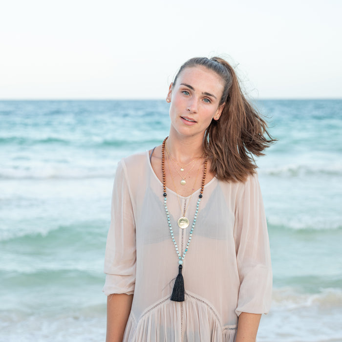 The Let It Go Mala Beads Necklace, a handcrafted mala featuring warm sandalwood beads, soothing amazonite gemstones, grounding black onyx accents, and a bold black tassel. The necklace is coiled in a circular arrangement against a white background, embodying balance, protection, and the art of letting go. Yoga Jewelry by Blooming Lotus Jewelry